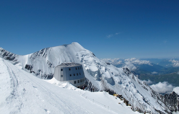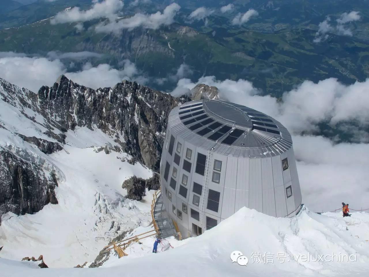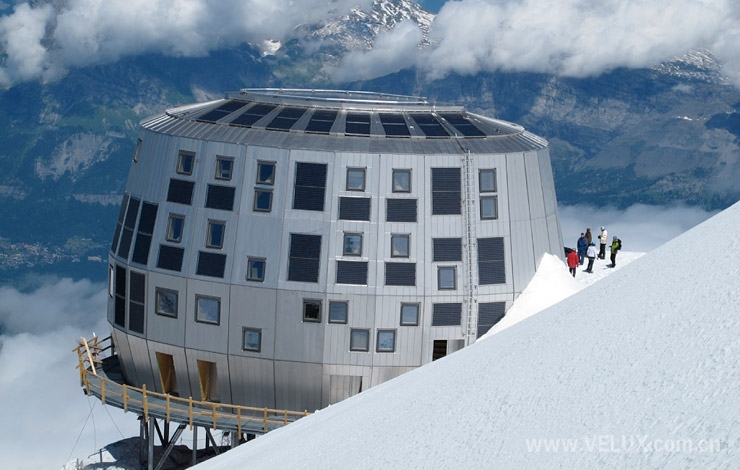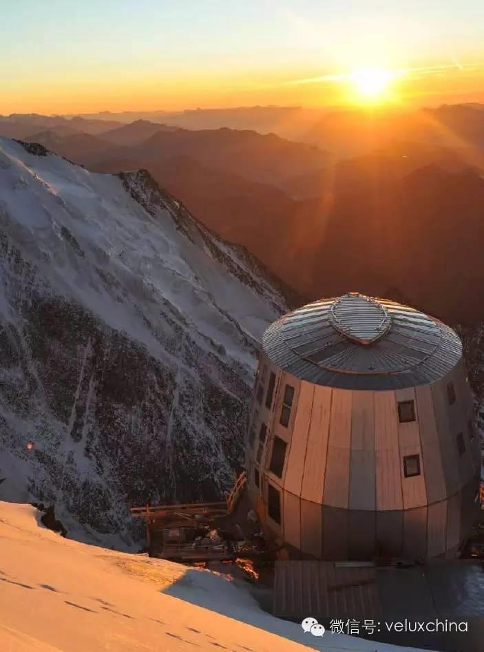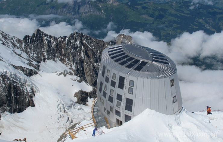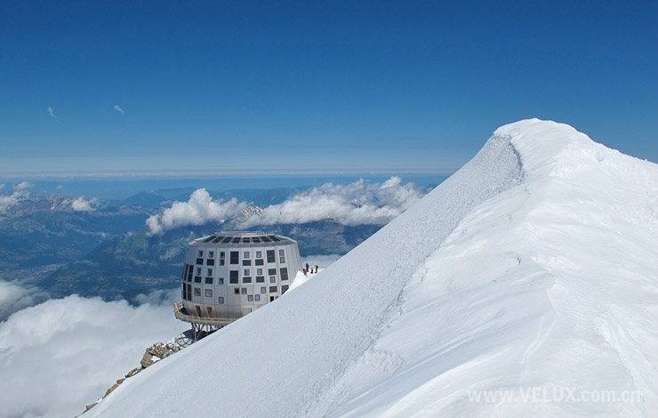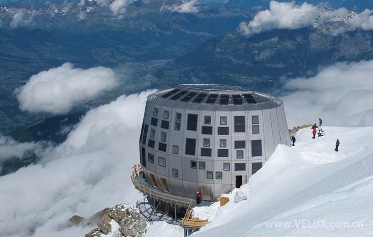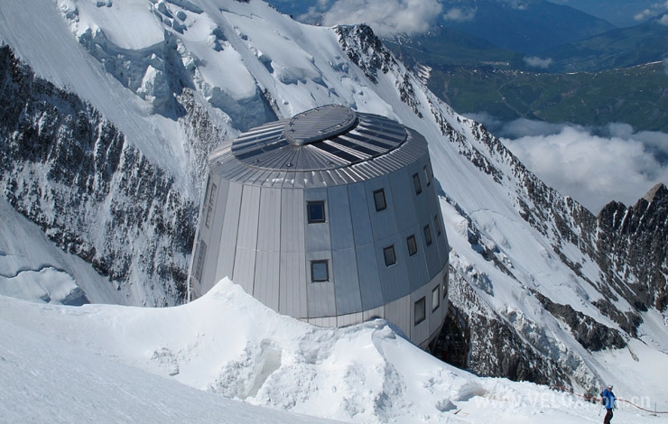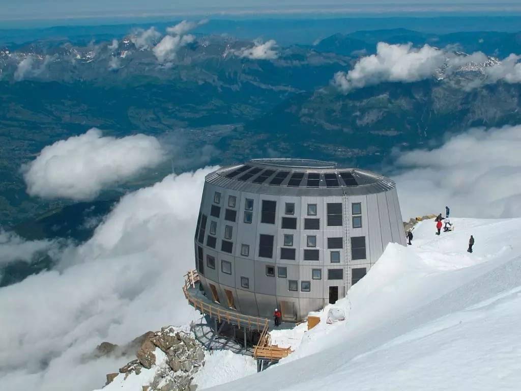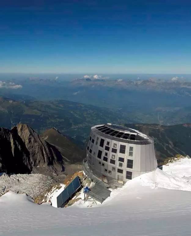 在法国勃朗峰海拔3,835米的一座悬崖边缘上伫立着新建成的古德登山旅社。建筑独特的结构形态和充满未来感的金属外观使其成为攀崖路途中最为令人瞩目的标志,即使在山下的村庄中它也清晰可见。