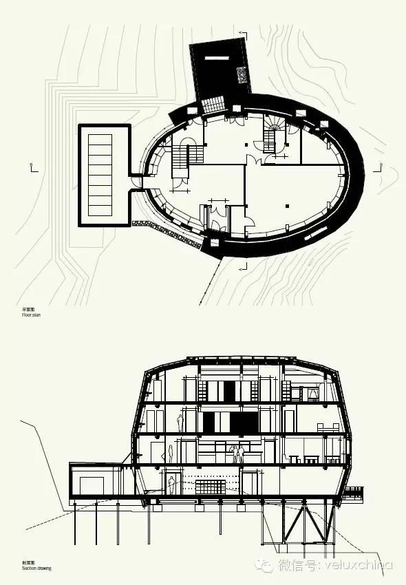 建筑采用椭圆形平面构成具有弧度的圆柱体量,根据风向选址,将风阻力最小化,使屋顶积雪也不易堆积。结构还将减少建筑表皮面积,以降低内部空间的热损耗,同时为室内引入自然光和户外观景。