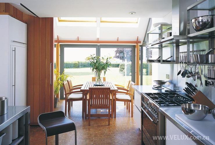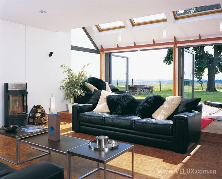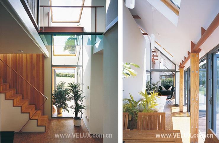 由于屋顶安装了12樘威卢克斯的配有严密排水系统的GGL中悬式开启屋顶窗,让室内空气交互更通畅清新,更使整个房子位于南侧的后面部分包括起居室和温室,都可以很好地观赏斯坦福郡的田野和山脉。位于一层客厅顶部的六樘智能电控屋顶窗,可以通过控制面板或遥控器实现开关,使高位开窗通风更方便。
