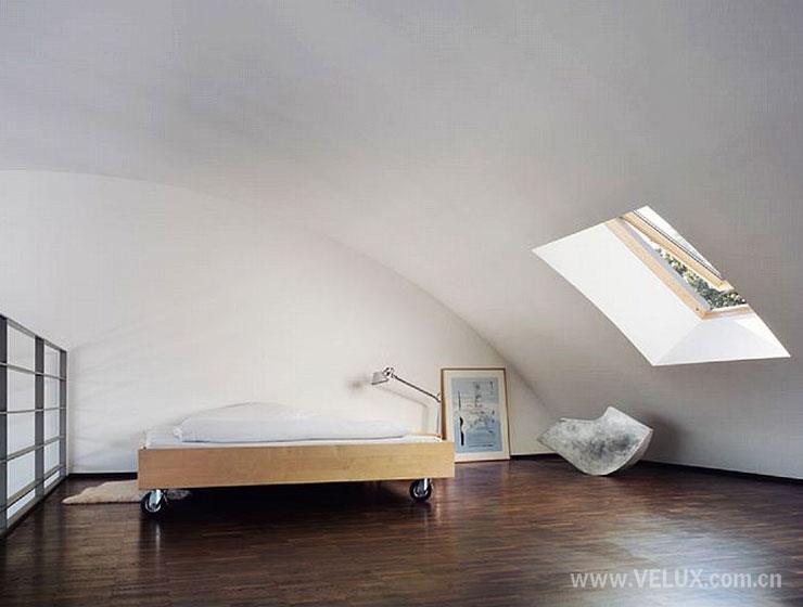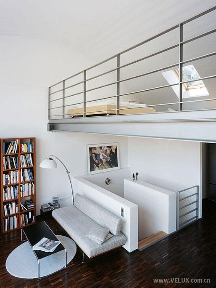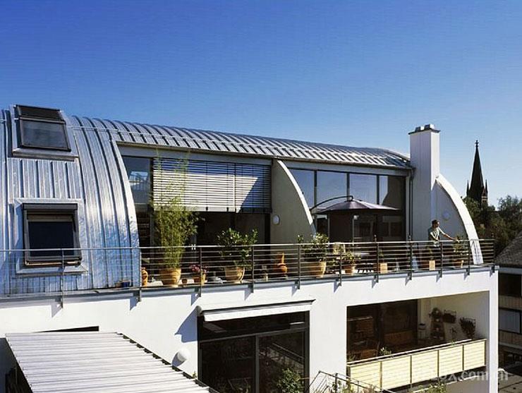 桶形屋顶下的一座带有夹层得复式公寓,光线从两侧的屋顶窗中射入。屋顶公寓南面拥有一个大的阳台,它位于屋顶的覆层中 。