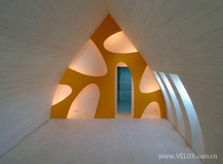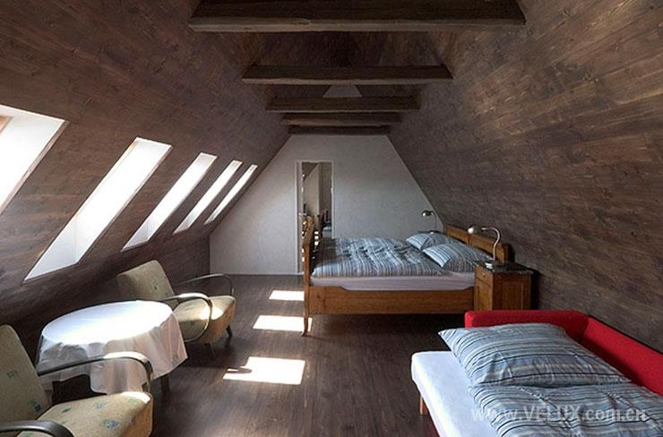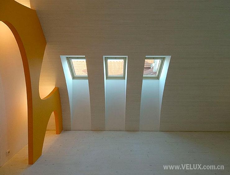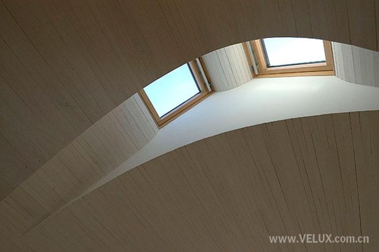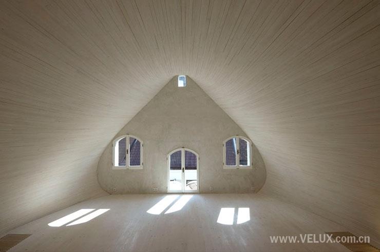 三层的阁楼经过改造,原有的阁楼被划分成新单元。所有的房间都进行了精心设计,几乎看不出任何阁楼的痕迹,这是巧妙利用弯曲木制拱顶和褐色木板的结果。整个空间进行了弯曲处理,隐蔽了角形墙壁。同时建筑师还对采光进行了精心布置,使人们对光的来源产生错觉。威卢克斯为项目提供了特别的顶部天窗安装改造方案,改造后天窗为拱顶下室内带来了明媚的阳光,与外部空间交互的宽敞视野,再加之窗体卓越的隔音性,塑造了舒适安静的室内环境。
