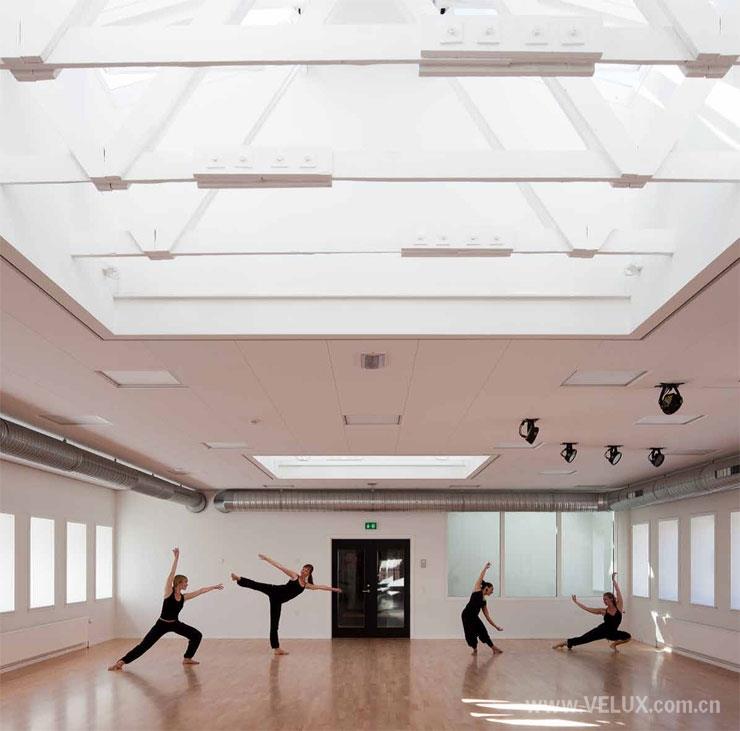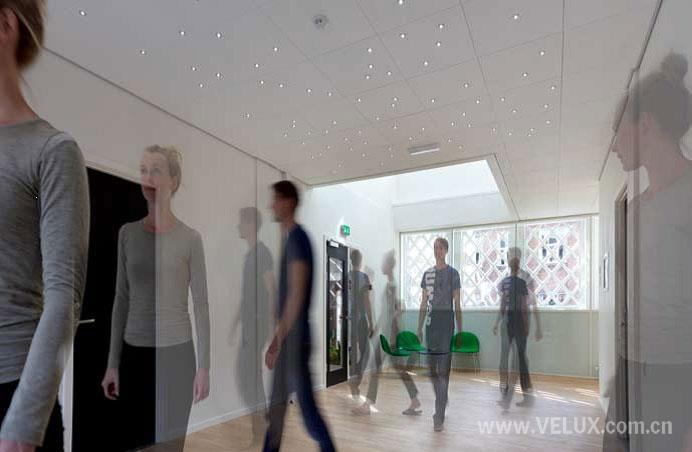现在与改造前相比,文化中心内部的房间宽敞明亮了许多。任何人第一次进入这座建筑都会马上注意到这一点。从临街一侧进入,来访者会首先会看到楼梯。沿楼梯而上左侧进入入口大厅。这里,一部分天花板被拆除,安装的威卢克斯太阳能动力屋顶窗将更多日光引入室内。一条与临街平行的走廊通向一个大型多功能厅和三个小会议室。这些房间均由自然光照明,光源有的直接来自面朝花园的竖窗,有的则是间接通过顶部的天窗。
