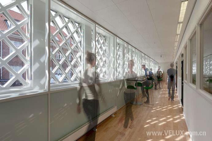 这种内部分割方式有利于室内气候调节。尽管有内侧玻璃幕墙,走廊并未采取其他区域的隔热措施,所以只是起到了内外缓冲区的作用。入口处的两层楼空间起到了烟囱作用,陈旧空气变暖上升,通过高处位于屋脊下的屋顶窗排出室外。