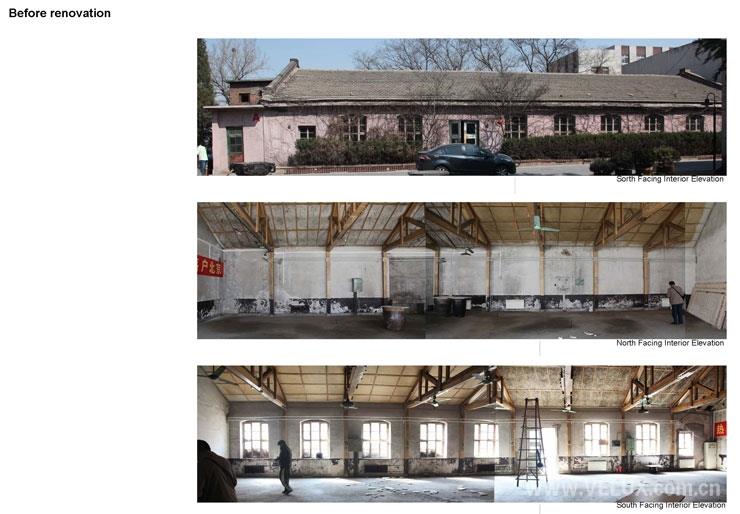 建筑中心占用的是大院中临胡同的一栋单层坡顶的车间厂房,改造前主体部分是十榀木构架形成的开敞空间。由于朝北和另一栋房子共用隔墙,建筑只有朝南和朝东有窗。夏天茂密的爬山虎将墙和窗的大部分都盖住,从外面看是一栋悦目的“绿色”建筑,里面采光却严重不足。车间朝西的一端是后加出的一个平顶的狭长空间,空间大部分地面都被一个大约7米多深的坑占据。深坑连通地下迷宫般的人防通道。平屋顶下方的梁上固定有巨大的铁钩,显然是某种升降装置的遗迹。在车间生产的年代,可能时常在地面和地下室之间运送东西。