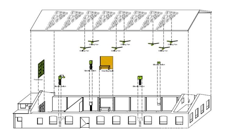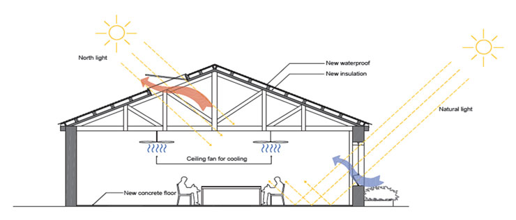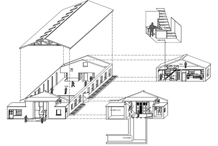 改造后的建筑中心里包含了门厅、书店、画廊、厨房、咖啡吧、办公室、卫生间及开放工作空间。十榀木构架最西边的两跨是画廊,由隔墙把它和开敞的大空间隔开。最东边的一跨被改造成两层,容纳办公室及厨房卫生间等辅助功能。中间部分是完全开敞的多功能空间,通常包括报告厅及开放的研究工作室。6个3米长3米高有3个轮子的灵活隔断可以自由地分隔多功能空间,以容纳不同人数和要求的展览、演讲、座谈会、派对、小组工作等各种活动。6件同样装有轮子的2.4米宽1.8米高的活动家具,容纳了150把椅子并提供给学生和研究人员使用的书架及带锁的柜子,它们也可以用来辅助分隔空间。活动家具的背面贴软木,供评图使用。