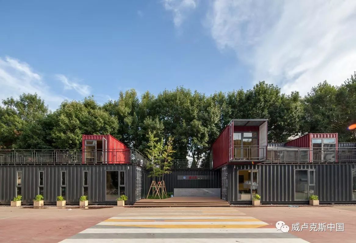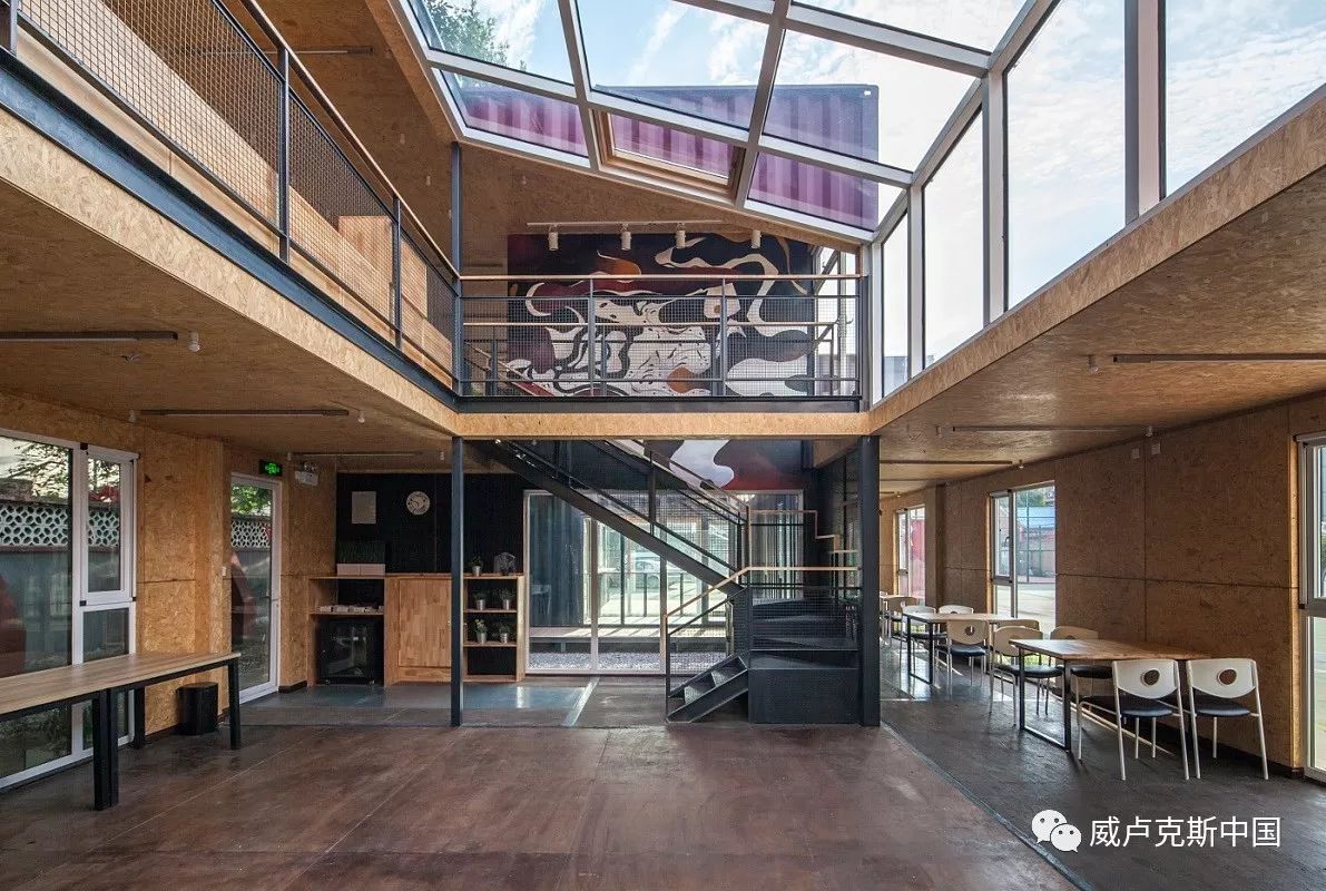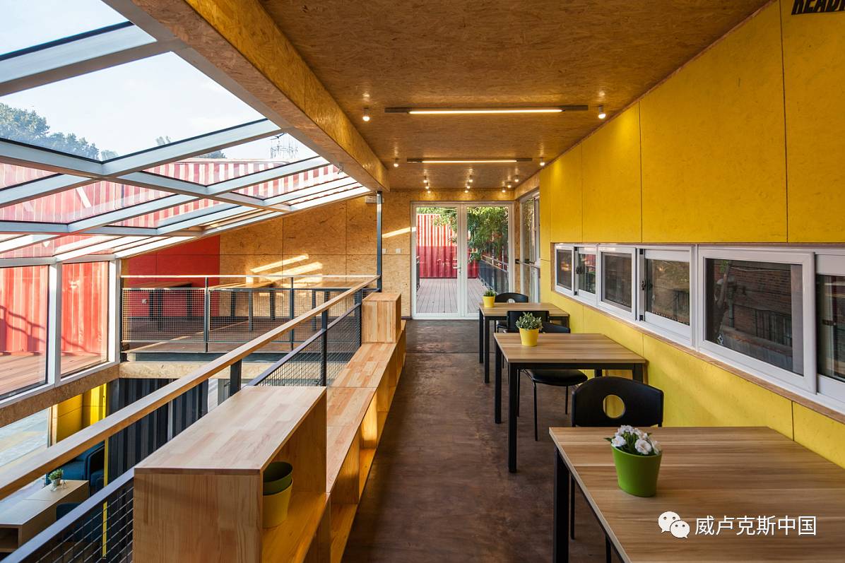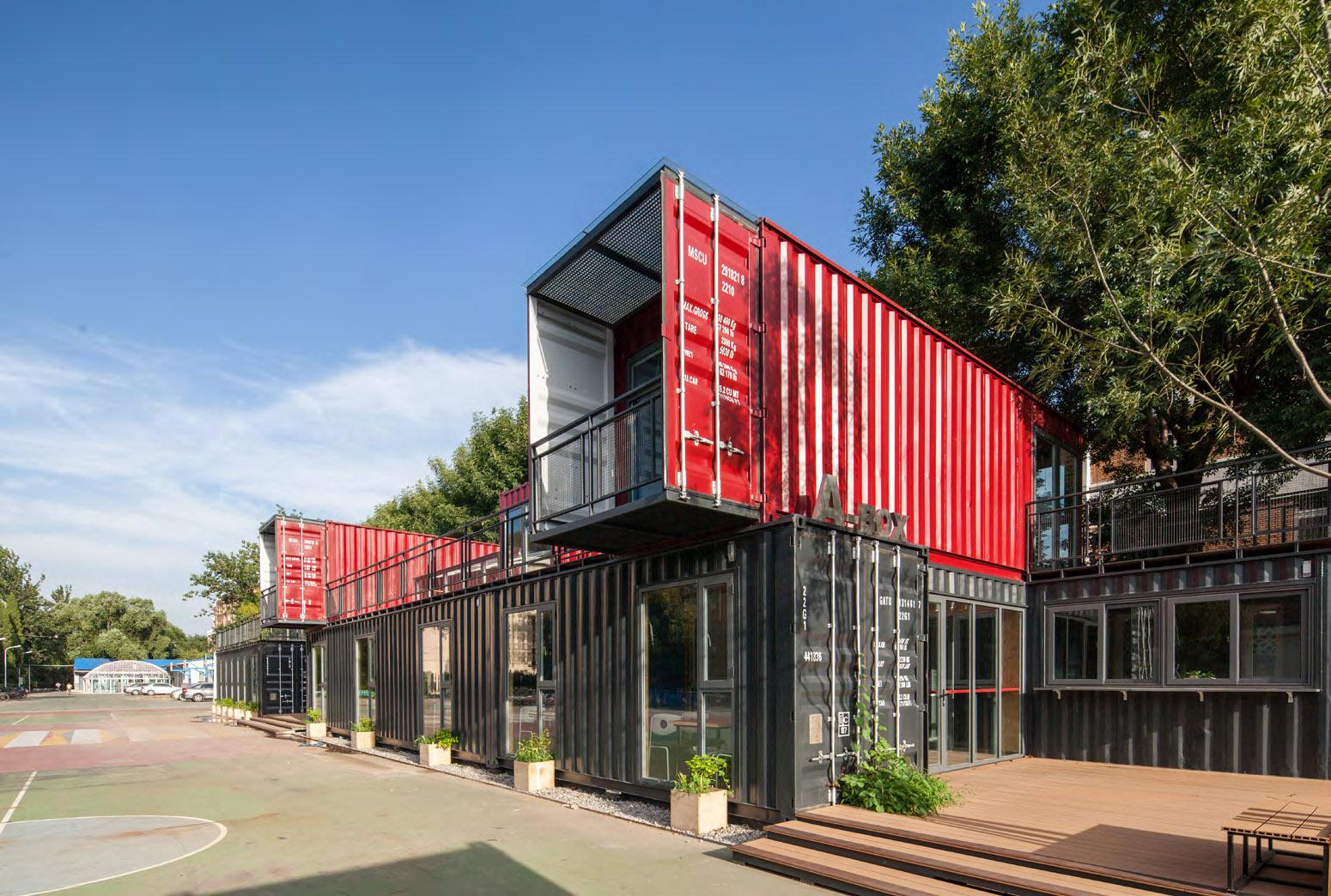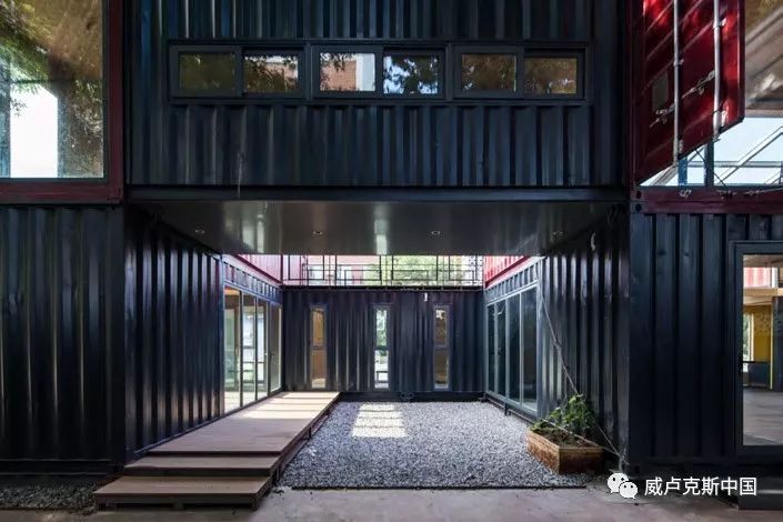 设计通过对8个废旧集装箱的排列组合与局部拆解,构成了一个依次展开的空间逻辑,并通过轴线和对景将周围环境纳入建筑之中。由于集装箱改造设计的特殊性,设计在参考大量构造图集和案例的基础上对室内外多个节点进行了创新设计,并在与施工方的积极配合下进行多次修改和完善。