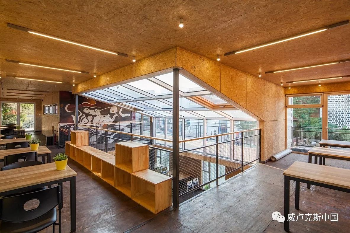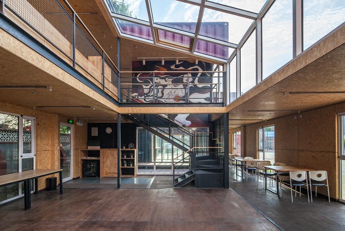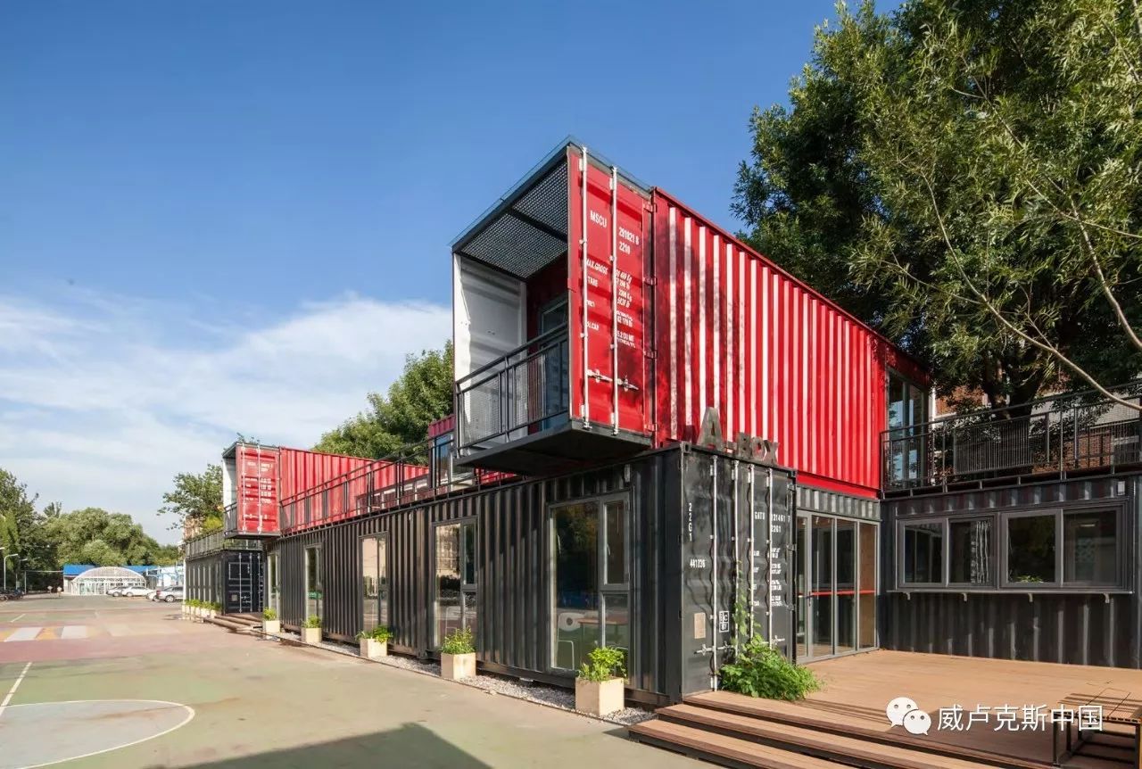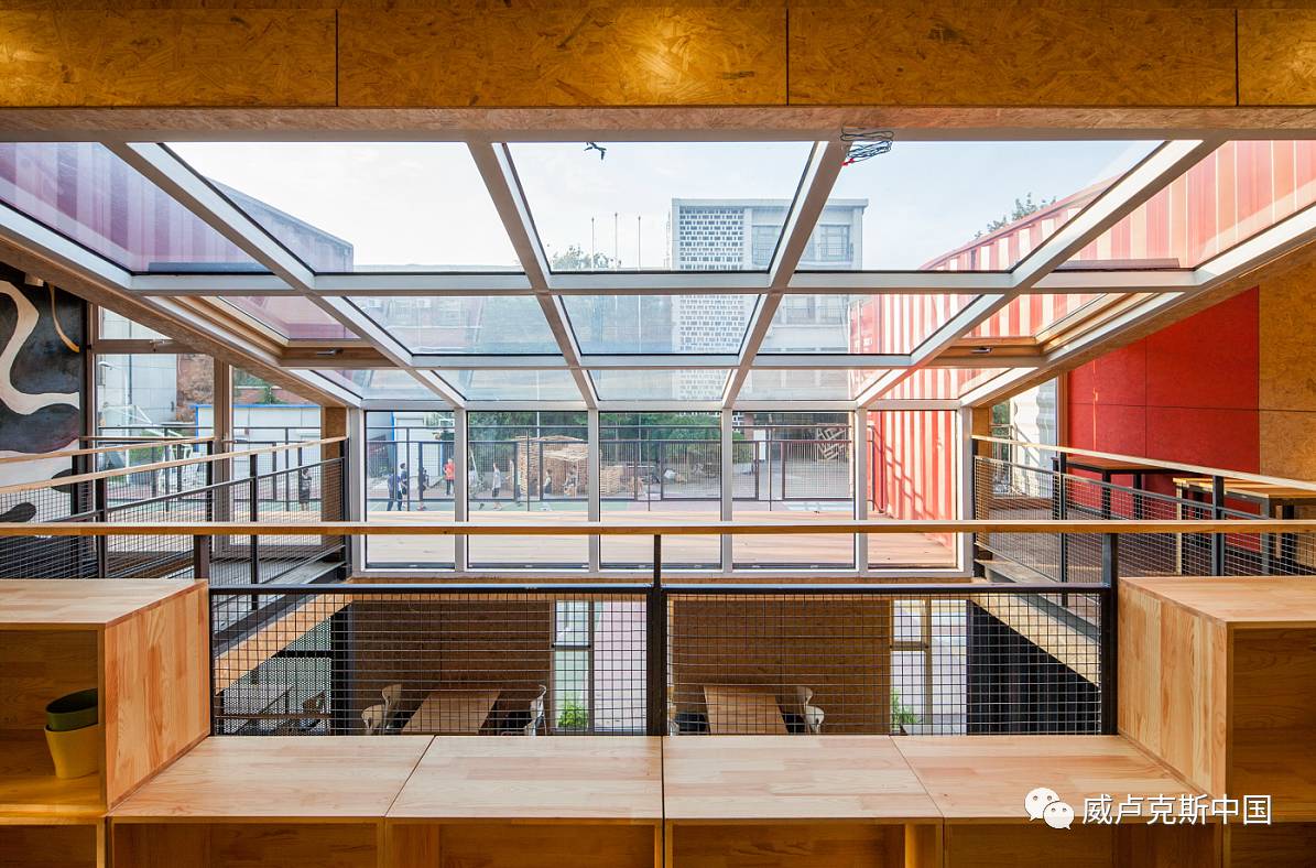 设计通过对8个废旧集装箱的排列组合与局部拆解,构成了一个依次展开的空间逻辑,并通过轴线和对景将周围环境纳入建筑之中。由于集装箱改造设计的特殊性,设计在参考大量构造图集和案例的基础上对室内外多个节点进行了创新设计,并在与施工方的积极配合下进行多次修改和完善。