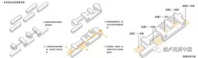 通过一二层箱体的交叠排布和东西向视觉轴线的布置,营造出“开放流动”的“庭院系列空间”,使得室内外空间形成“动静”、“收放”、“明暗”的对比与渗透,这种理性而又创新的设计理念将工业美学与东方禅意巧妙结合,为师生的日常学习生活营造出了各具特色的五个室外庭院、一个通高室内中庭及三处室外平台。