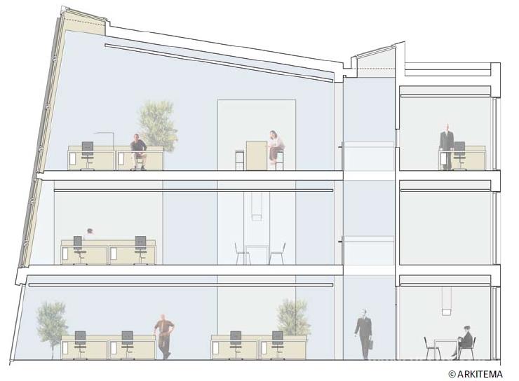 “主通道”环境舒适,空气流通性很好,为业主们创造了一个富有生气的互动环境。大楼南侧配有宽大玻璃幕墙,入口和屋顶应用了威卢克斯公司自已的天窗,这条通道可以让人们真切感受到季节变化和晨昏交替。连接三座配楼的悬桥被粉刷过,全部都朝向主通道,它们的窗户朝着宽敞明亮的房间。这些结构除了可以使办公室员工享受到来自宽阔中心区域的光照之外,还打断了原本呆板的连续性结构,让人们对办公室的情景一目了然。