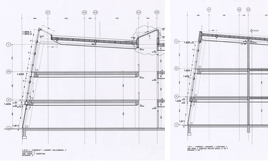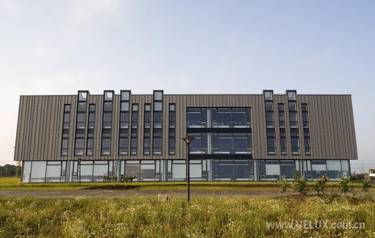 威卢克斯所处的配楼在视觉上很突出,从外部看,这些小尺寸结构的斜窗与宽大的镀锌板形成鲜明的对比。天窗安装在倾斜的窗支撑构件上,斜天窗代替了幕墙结构,成为屋面的一种延伸。窗户的纵向外观在明亮的镀锌板对比之下,得到了进一步强化。建筑立面近乎于垂直安装的天窗有两种尺寸,将北侧光线引入威卢克斯办公楼宽敞的开放式办公室。明亮的玻璃结构与宽大垂直的镀锌板结构形成美妙的对比。同样,折坡形状的屋顶两端的窗户则极为精确地突出了折线形镀锌板幕墙结构的特点。