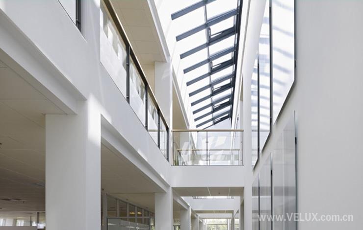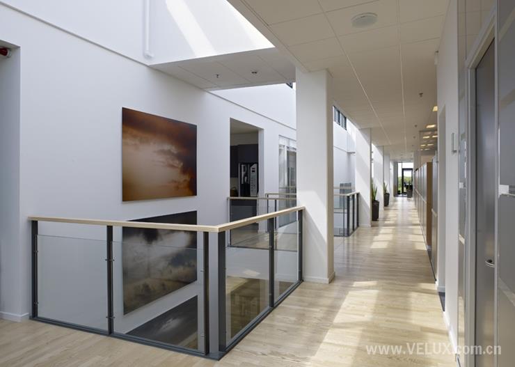 从闭合的连接处,你可以沿着悬桥进入办公区域。和宽敞的“通道”一样,悬桥为楼内空间带来了动感和变化。在这条内部通道的顶部也设置了天窗,新鲜的空气从大楼立面设置的天窗进入室内,然后沿着“带形天窗”上升,从而达到了最佳的自然通风作用。倾斜屋顶的威卢克斯天窗即可以手动,也可以利用最新的io-homecontrol®进行智能电动操控。