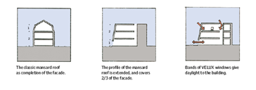 左图: 传统意义上的蔓莎屋面,成为了建筑立面的一部分 LEFT: The classic manard roof as completion of the façade,