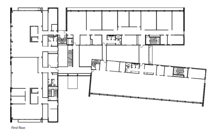 三座相邻的配楼结构中都有一条闭合功能性的附属建筑,其中有卫生间、复印室、小型办公室和其他设施。配楼墙壁内部为白色,面朝主通道的斜窗尺寸较小,所有这些特点都突出了其内敛的特性。