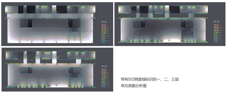 威卢克斯办公楼进行了水平照明模拟实验表明――所有三层楼的采光完全满足建筑标准。在门窗附近获取的采光系数值为6%-20%,而楼层开阔空间中部的测量值为2%-6%。首层和第二层的采光系数较高。采光系数在地板的不同位置上所呈现出的数值也很有规律,值得大家研究,这对于改善室内采光环境很有帮助。为避免太阳直射,设计人员在大楼东西两侧设置了有效的遮阳设施。
