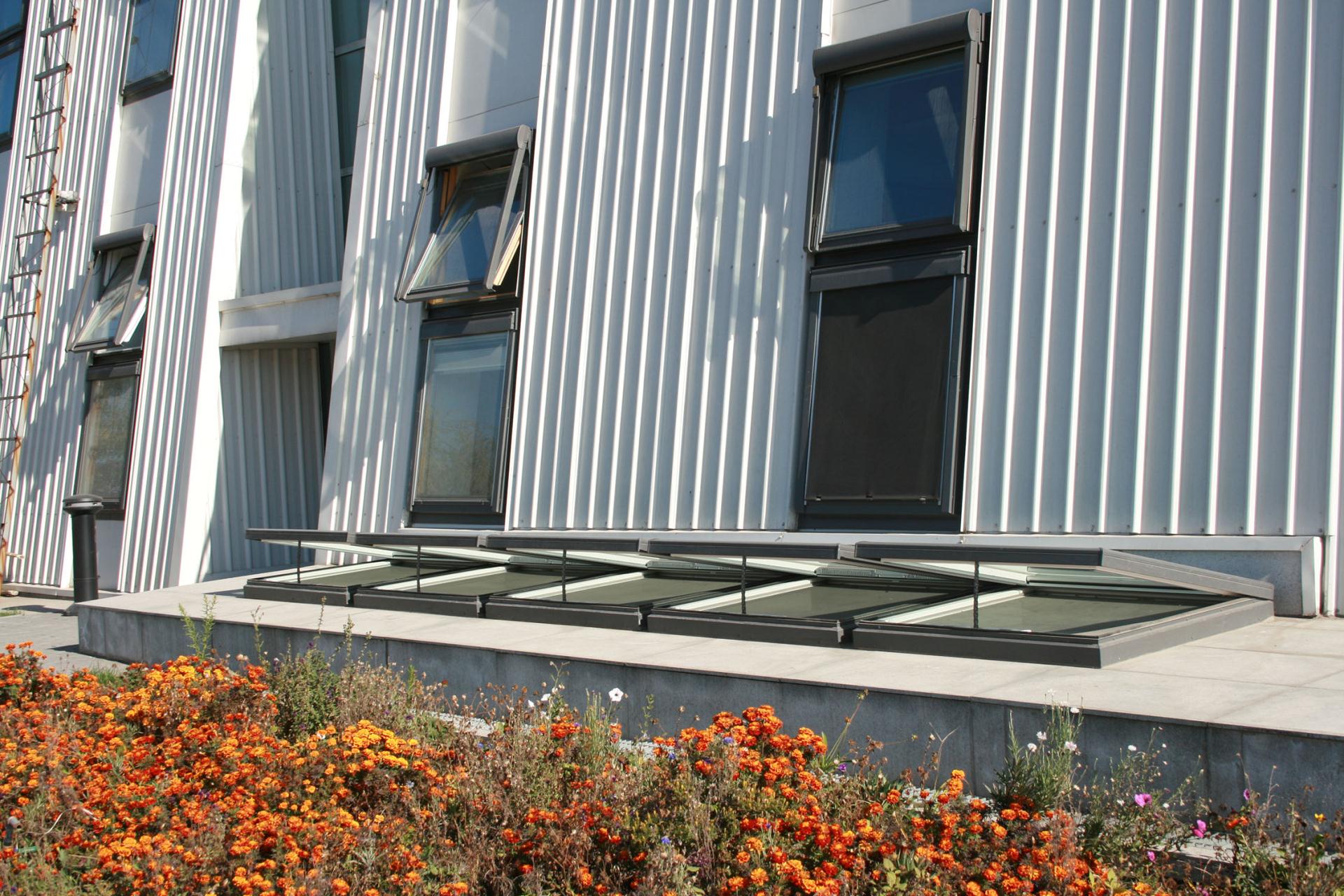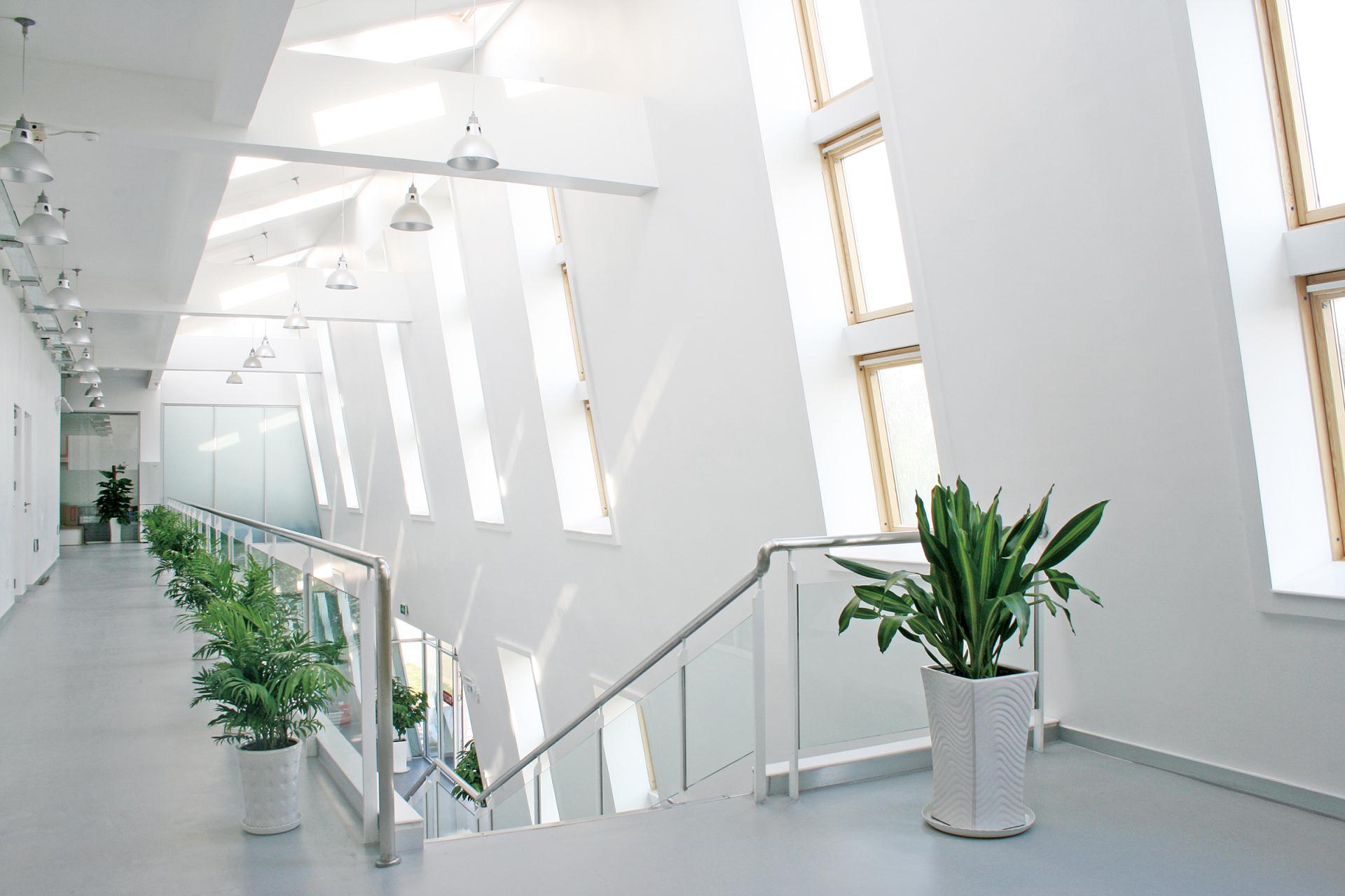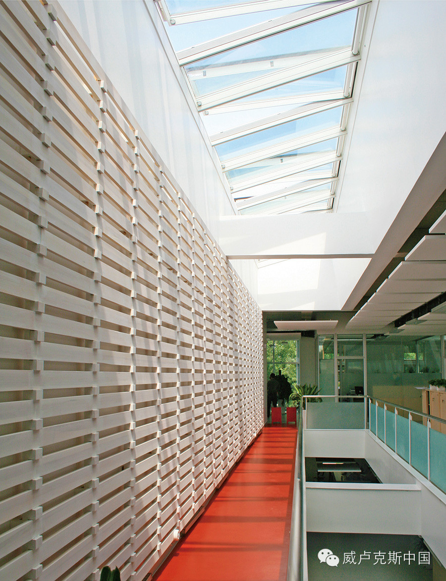 建筑立面和地下空间,由296樘威卢克斯窗组成的多条采光带,建筑中庭位置采用VMS商用天窗系统,加速室内自然的通风换气。