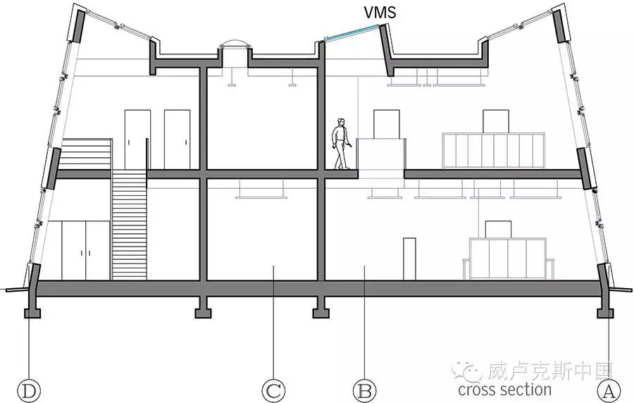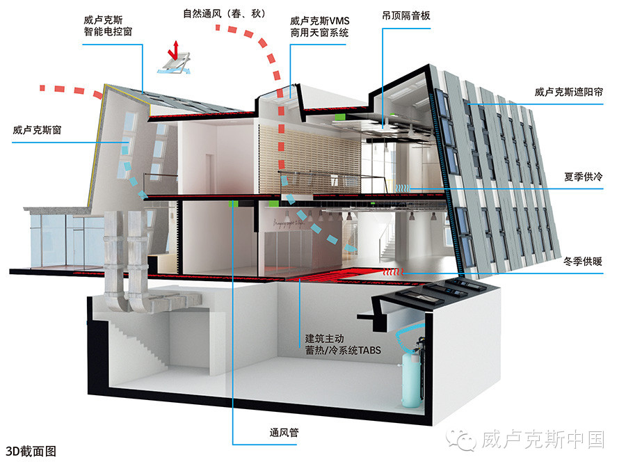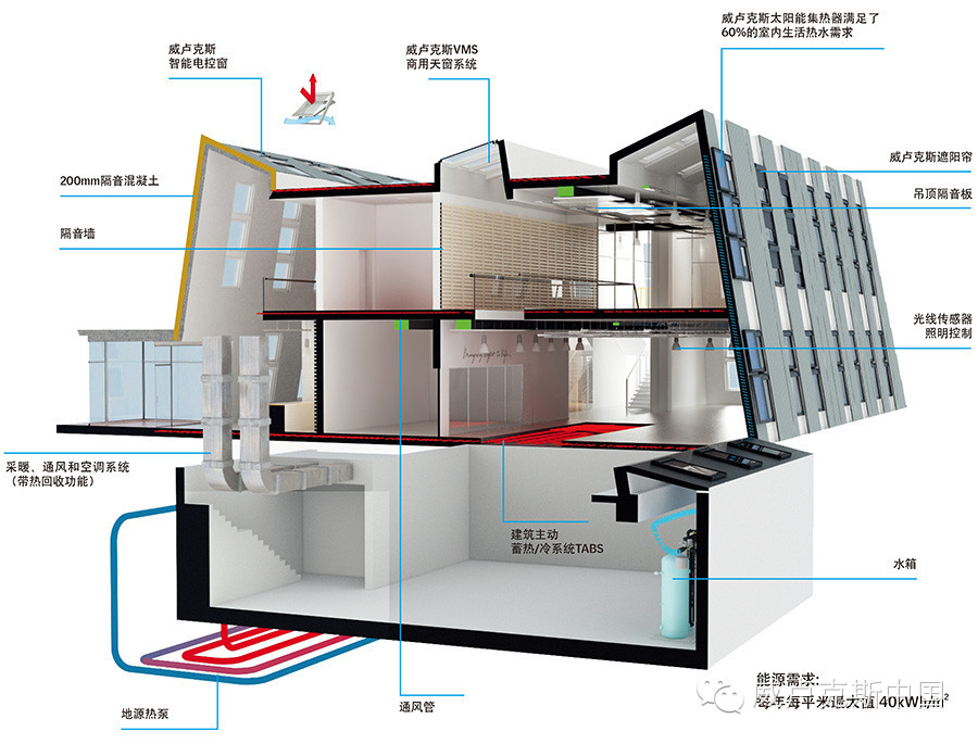 建筑主动蓄热/冷系统:这是一种在混凝土板中嵌入水管道的采暖/冷网络系统。搭配地源热泵和室外风机组(风量可变),建筑蓄热/冷系统能创造舒适室内气候并且可以大幅度节能。— 高效保温隔热且不透风的围护结构有效降低了冬季的热损失。岩棉保温地板:250 mm厚;屋顶:200 mm厚;墙体:200 mm厚。— 基于二氧化碳智能控制的通风系统— 使用VMS商用天窗系统和智能电控窗— 太阳能集热器,用于室内生活热水供应— 智能控制的室内外遮阳帘,隔热效果极佳,减少炎热天气的制冷耗能— 热泵:利用土地热能,对建筑进行制冷或供暖