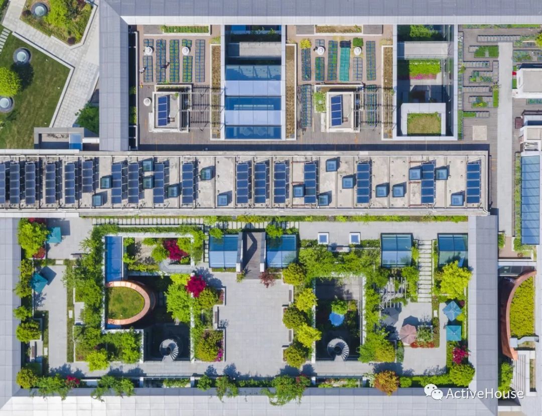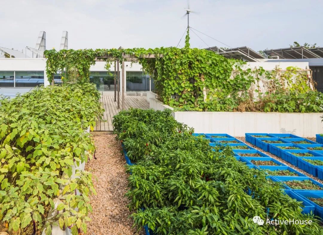 屋顶农园:西侧为630m2屋顶农园,有鱼菜共生的桑基鱼塘,也有设计师共享的四季生机厨房,产出的有机蔬菜直供员工食堂。