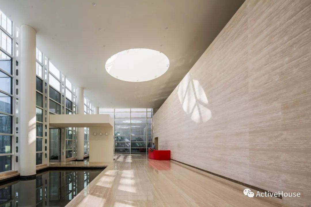 交错院落式设计有效将自然风与自然光线和绿化景观引入办公空间,全玻璃幕墙与多种形式的天窗、侧窗、光导系统结合,塔楼跨层全玻幕墙连接结构,实现全部办公空间都有天然采光。