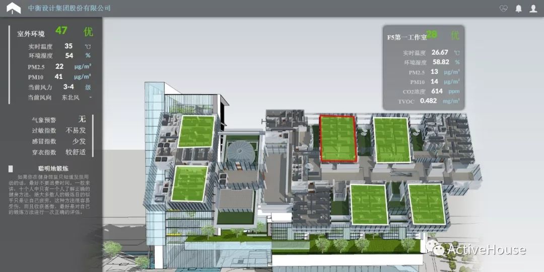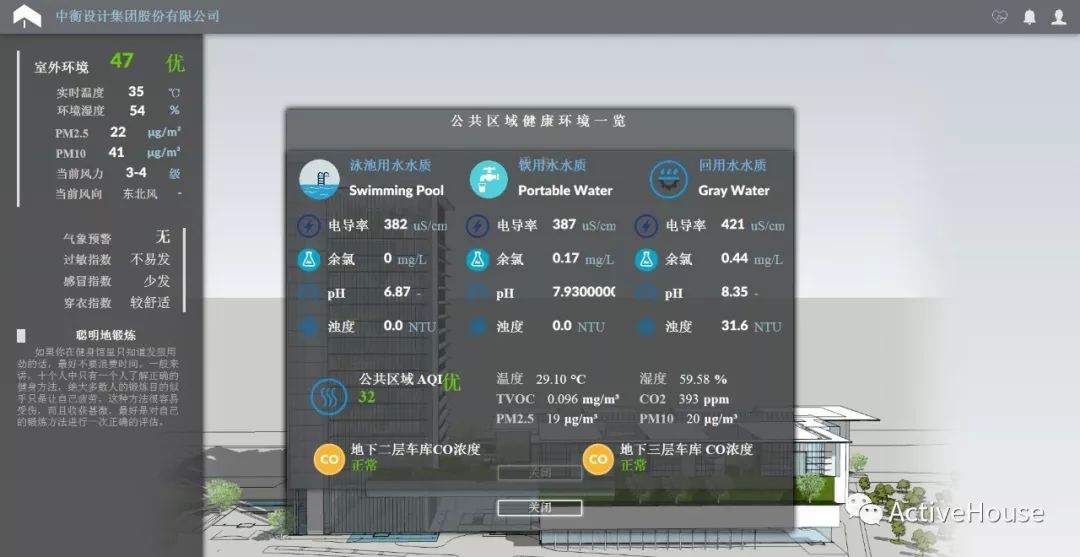 室内环境监测平台:实时监测水质(浊度、pH、余氯和电导率)和空气品质(温湿度、CO2、CO、PM2.5、PM10和TVOC),并自动计算空气品质表观指数(AQI)通过内部网络向员工展示,监测系统与新风系统联动。