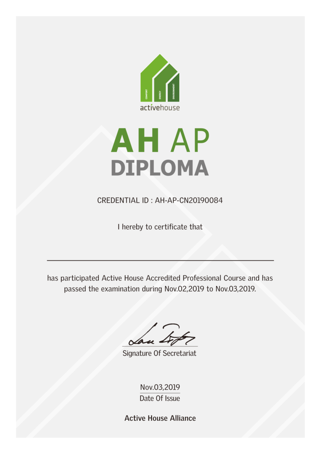 由Active House Alliance颁发AH AP专业咨询师资格证书