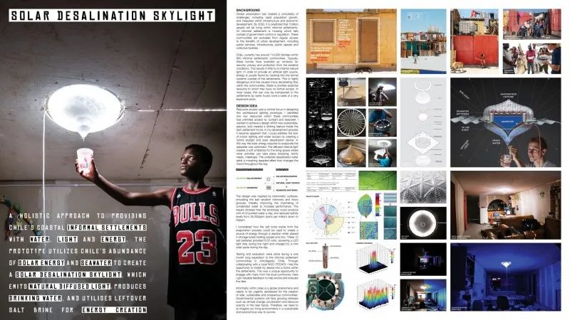 该项目采用整体方法为智利的非正式沿海定居点提供水、光和能源。该原型利用智利丰富的太阳能和海水创造了一个太阳能海水淡化天窗,它发出自然漫射光来生产饮用水,并利用剩余的盐水进行能源创造。资源是设计此建筑照明原型的中心焦点。这些社区可以无限制地获得阳光和海水。漫射的内部光线为生活空间营造出柔和的氛围,收集的淡水增加了斑驳的效果,改变了一整天的心情。该设计的灵感来自仿生表面,模仿叶脉网络,从而改善冷凝水的通道以提高性能。