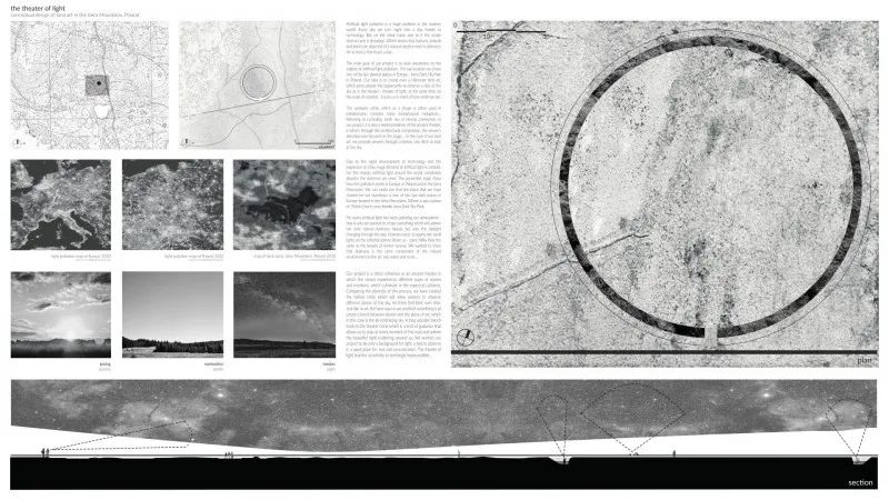 人造光污染是现代世界的一个大问题。我们用科技把黑夜变成白昼;结果,我们的整个昼夜循环都被打乱了。当太阳不在天空时,人类、动物和植物被剥夺了在黑暗中生存的自然需要。项目地点位于波兰的伊泽拉黑暗天空公园,是欧洲最后一个最黑暗的地方之一。这个想法是创造超过一公里的艺术区,让人们有机会像在剧院一样观察一片天空——一个光的剧院。灯光艺术被塑造成一个圆形——一种常用于天文馆的形状——象征着周期性、地球、天空和永恒的联系。