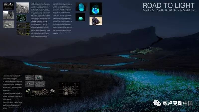 天津大学建筑学院参赛团队由罗宇涵、兰迪、刘媛、刘雨松四名学生组成,指导老师为辛善超和孙德龙。他们的作品《向着光》聚焦于第三世界国家山区道路电力基础设施不完善等问题,为保障儿童上下学安全性,展开别出心裁的设计创意:用廉价、易得的萤石“铺设”一条“光之路”,萤石会在夜晚发出色彩并持续数小时,营造了一段安全而富有趣味性的行程。该方案的巧妙性、实用性及“极富人情味”,给国际评委留下了深刻的印象。
