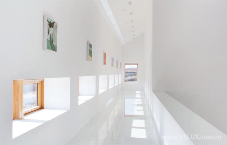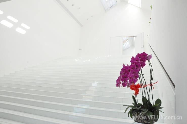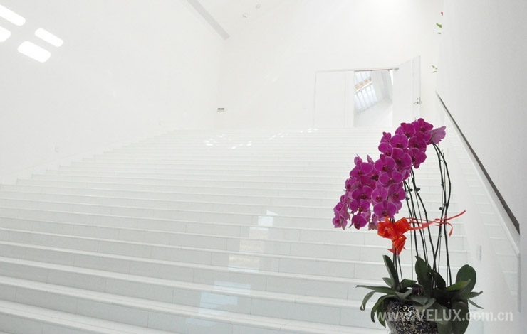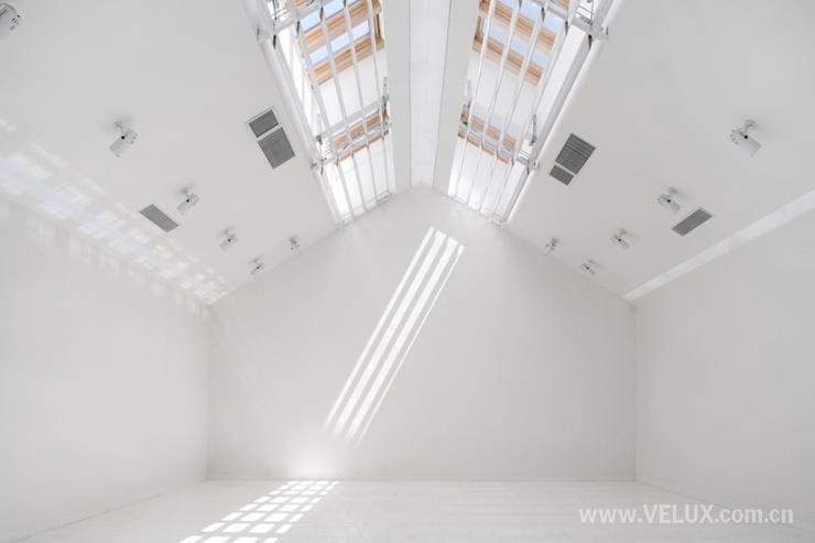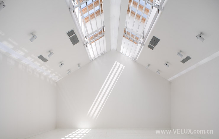 在屋脊位置设置的威卢克斯智能天窗,为楼梯及二层主展厅的提供自由可控的日照采光。天窗具有自动定时开关,及雨水智能感应功能,天窗下设有电动百叶以控制光线,为展品提供保证,有效防止雨水溅污及紫外线直接照射。天窗关闭后,天花上的人造光带为展厅提供普通照明,而射灯为艺术品提供特别照明。