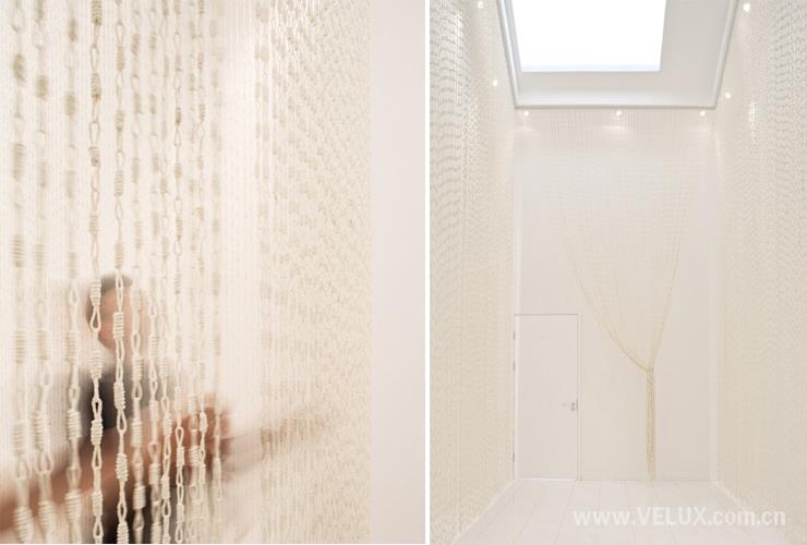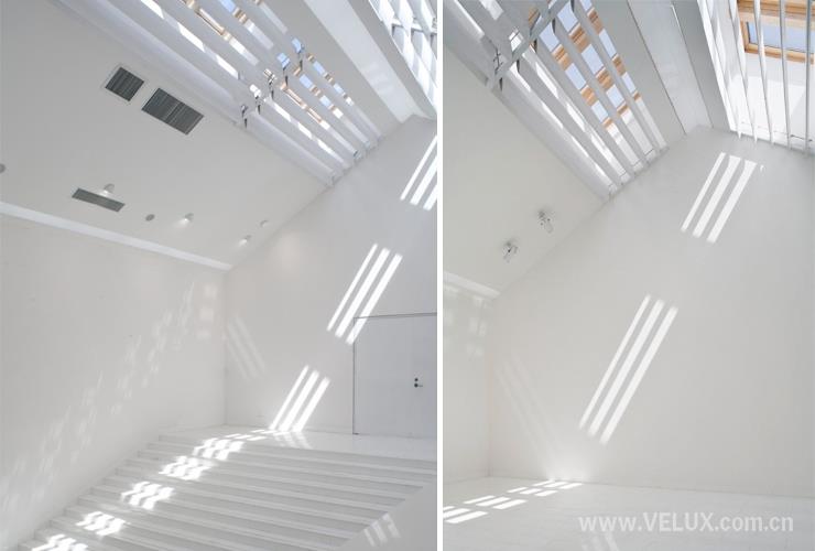 楼梯部分在光线设计中是整体建筑光线最炫的部分。从屋顶高位横向组合的威卢克斯窗导入的直射光,规则的洒落在楼梯走廊上,室内犹如光栅的大电动百叶帘,可视需求调整的进光量,在楼梯的踏步和踢步上形成规则的光线的律动。